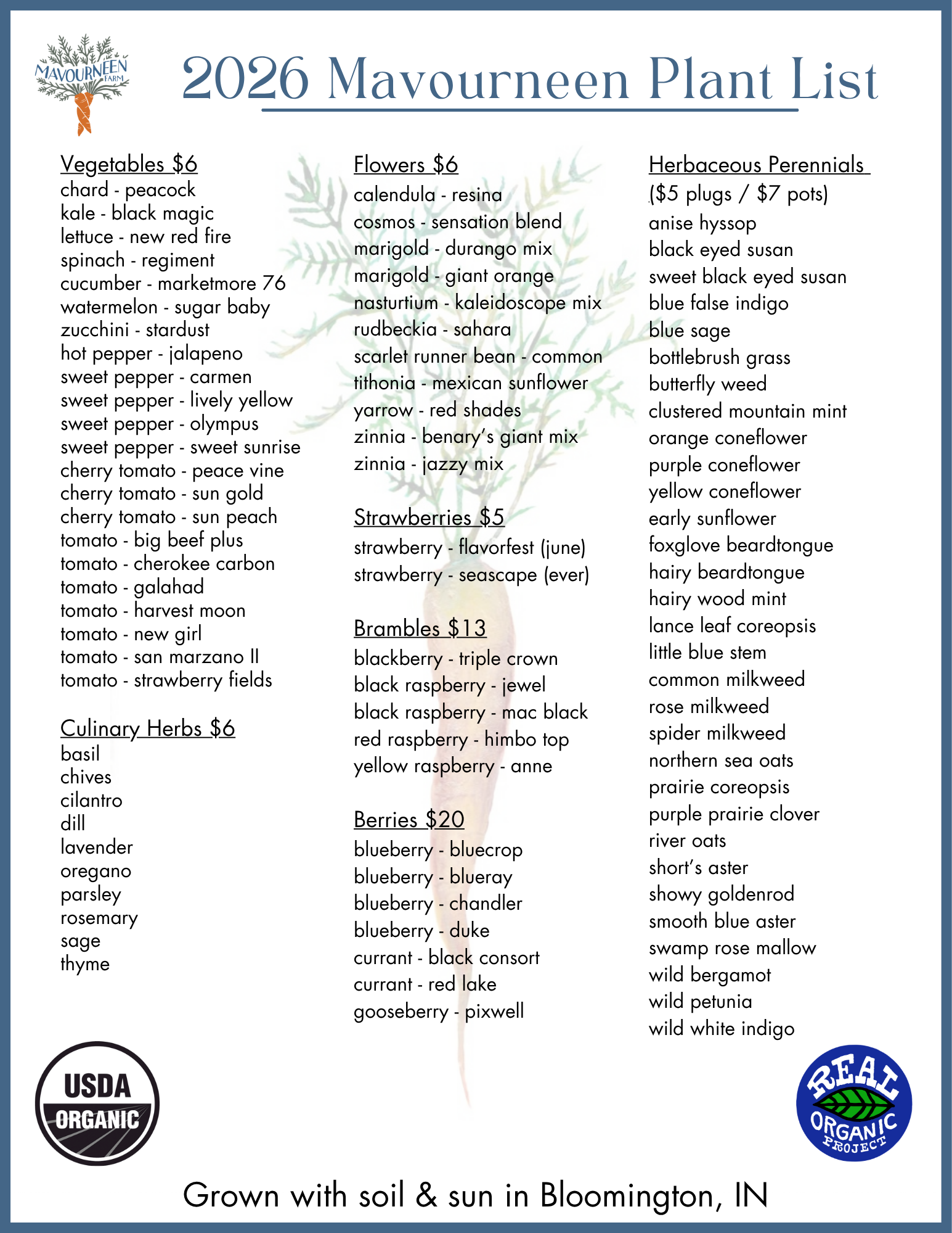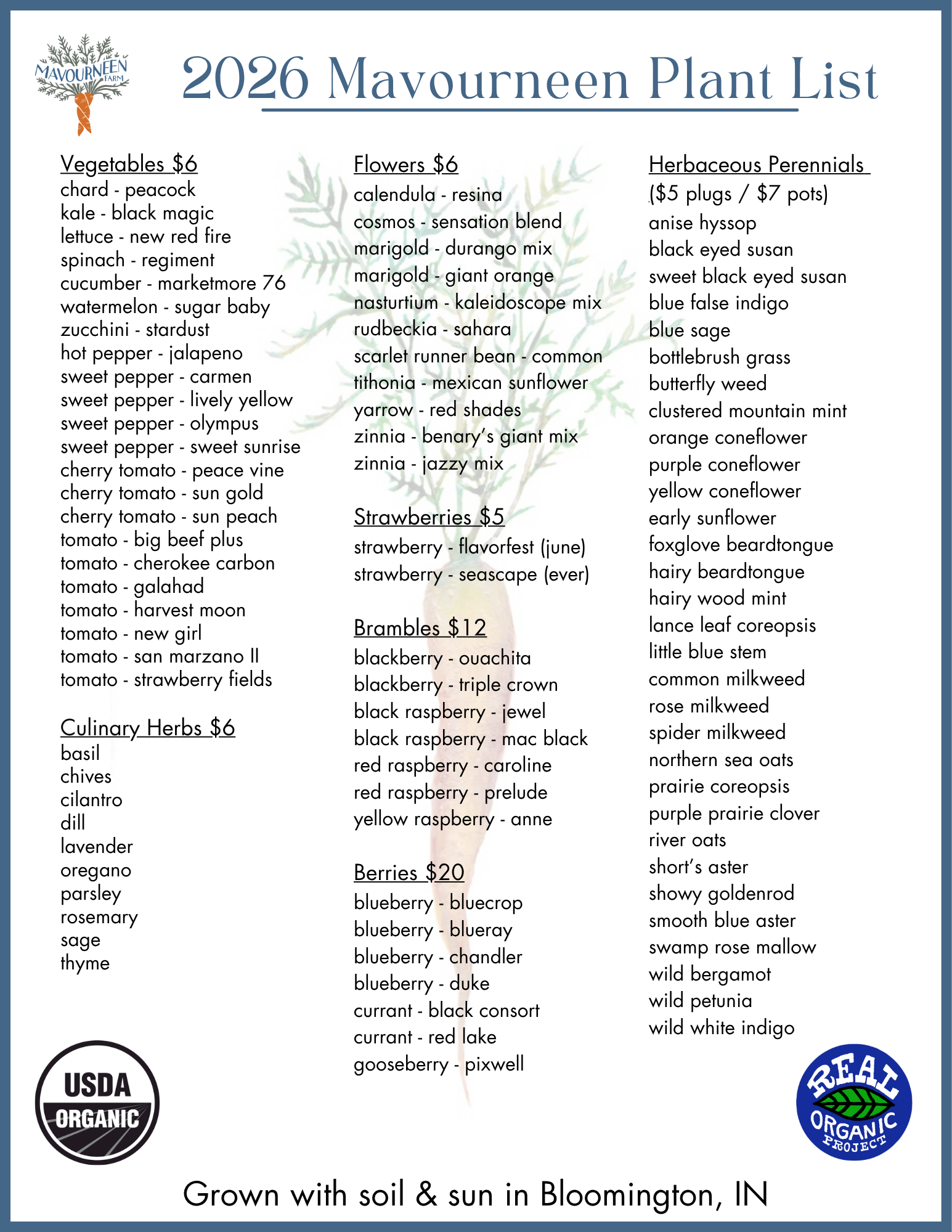 Welcome! Mavourneen Farm is a small, Real Organic Certified plant nursery and intensive year round vegetable operation. We are based on family land in rural Monroe County, just outside Bloomington, Indiana. Our production ethics are rooted in a concern for preserving the Earth, appropriately valuing food and farmers, and the creation of greater health and beauty.